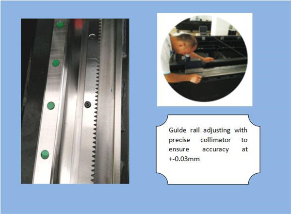 | Nama:Panduan Linear Ketepatan Sistem pemotongan maju, kuasa laser dan pergerakan servo saling saling satu sama lain, diimport gear ketepatan tinggi dan sistem pemacu rak, meja kerja berganda yang boleh ditukar, untuk memastikan kelajuan dan ketepatan pemprosesan yang lebih tinggi. |